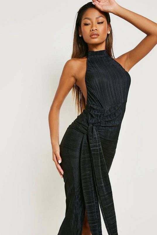BOOHOO Plisse High Neck Gathered Midi Dress