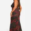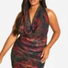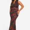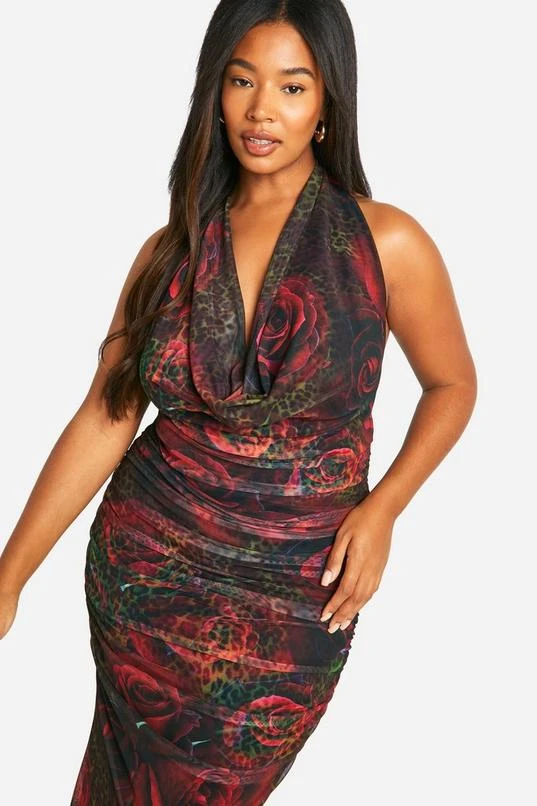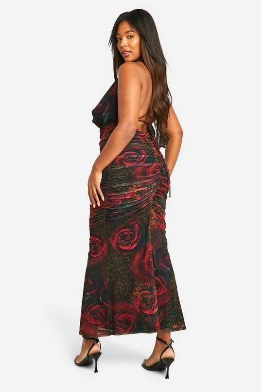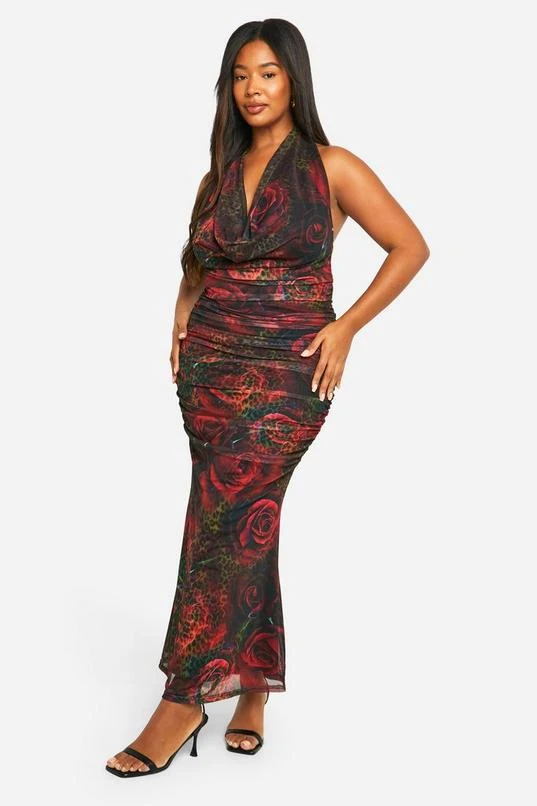 BOOHOO Plus Animal Floral Printed Halter Ruched Maxi Dress