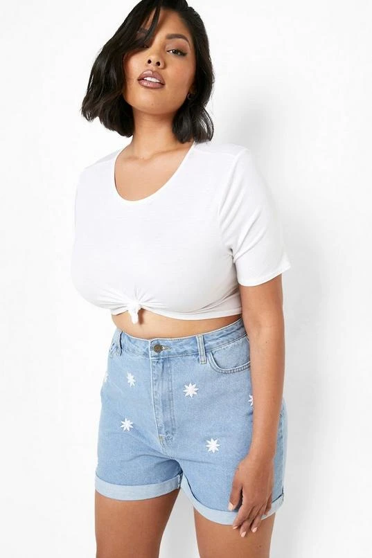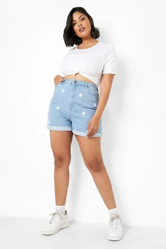 BOOHOO Plus Daisy Embroidered Denim Mom Short