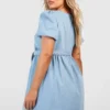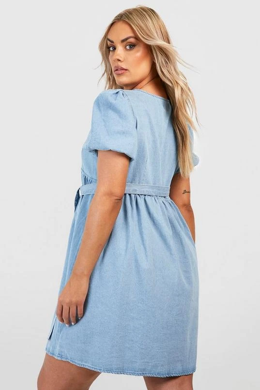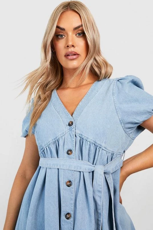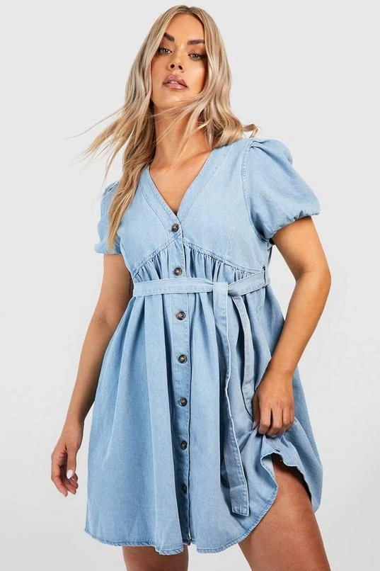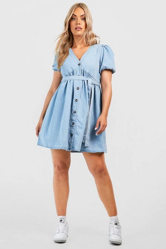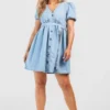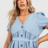 BOOHOO Plus Denim Horn Button Puff Sleeve Skater Dress