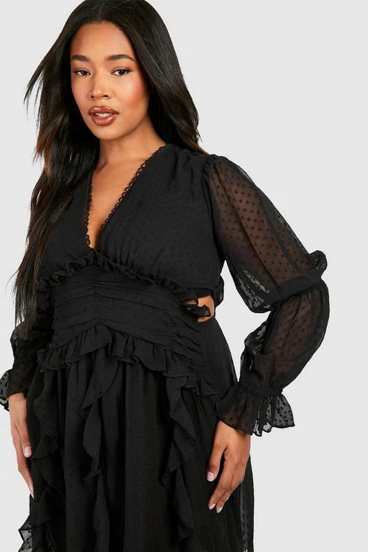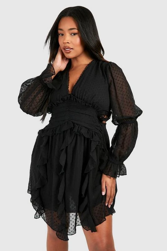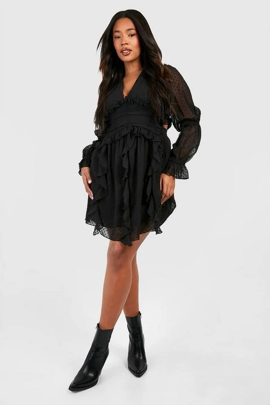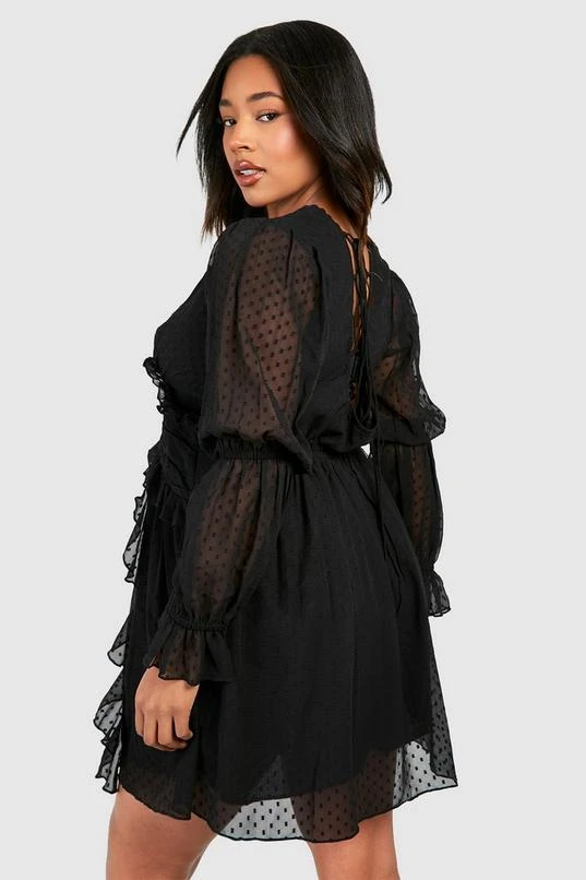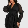 BOOHOO Plus Dobby Mesh Long Sleeve Plunge Mini Dress