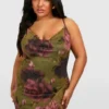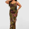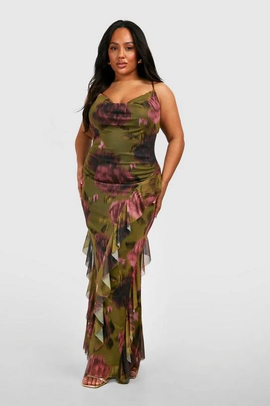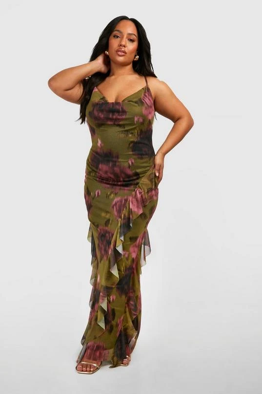 BOOHOO Plus Floral Print Mesh Ruffle Detail Maxi Dress
