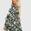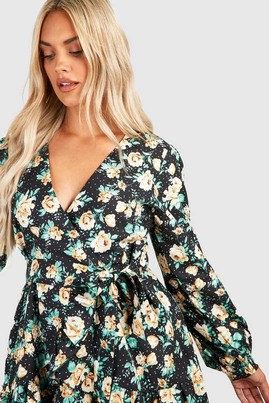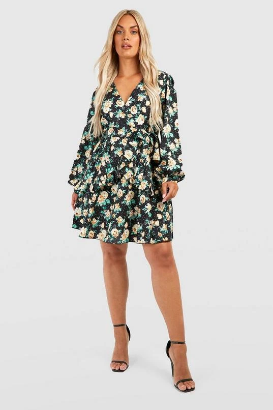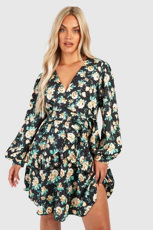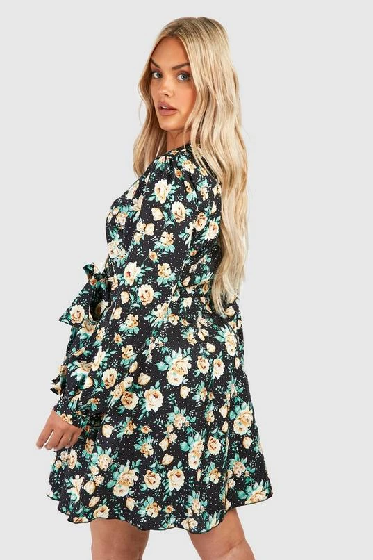 BOOHOO Plus Floral Ruffle Wrap Skater Dress