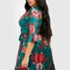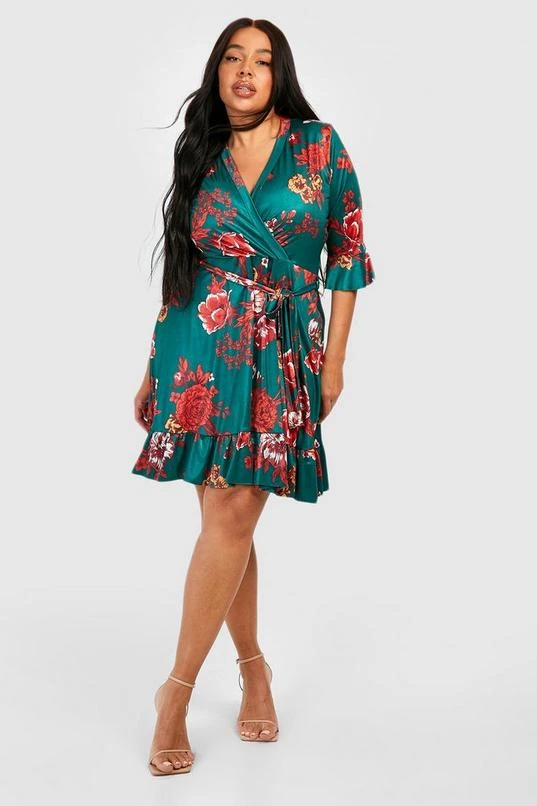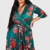 BOOHOO Plus Floral Wrap Belted Skater Dress