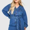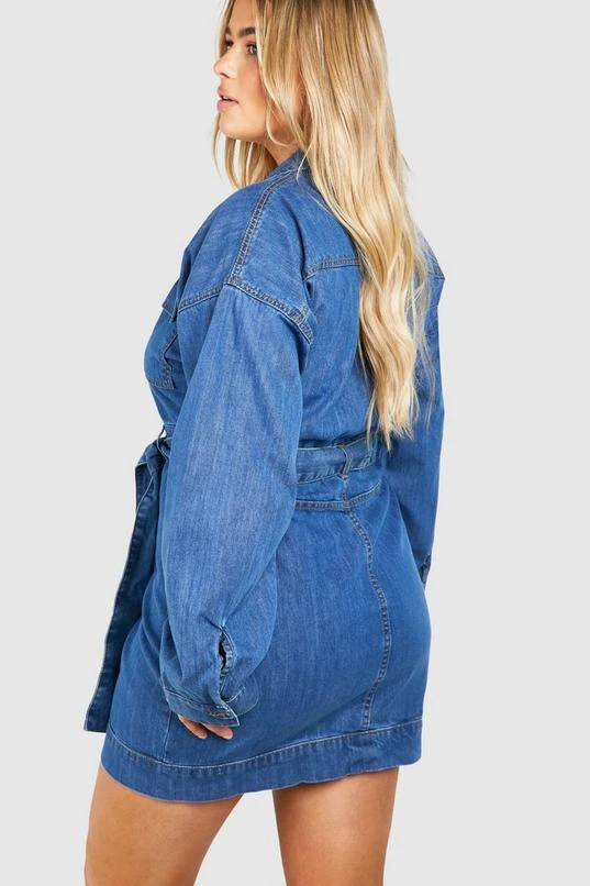 BOOHOO Plus Long Sleeve Tie Belt Denim Dress