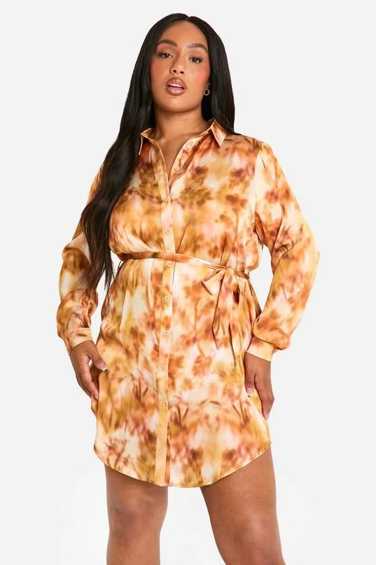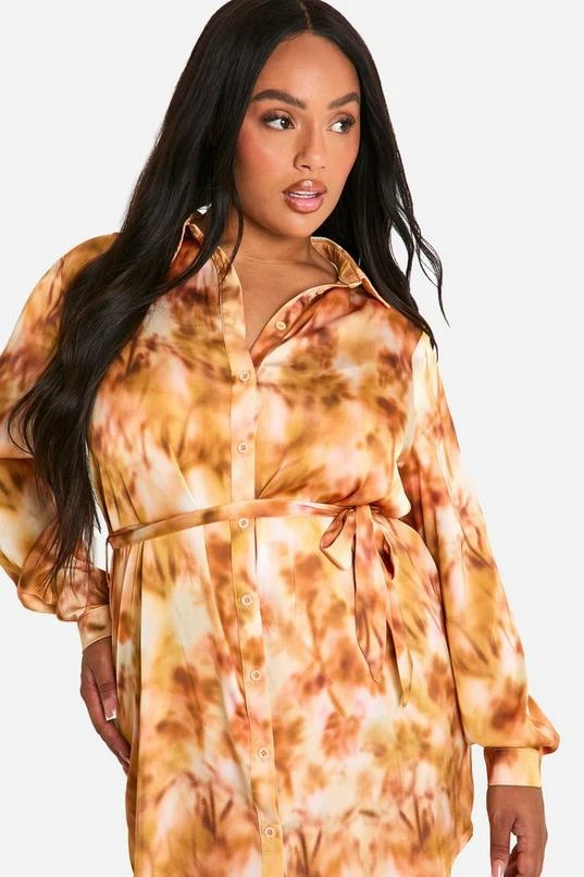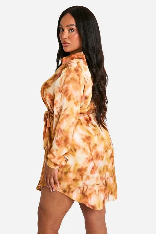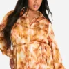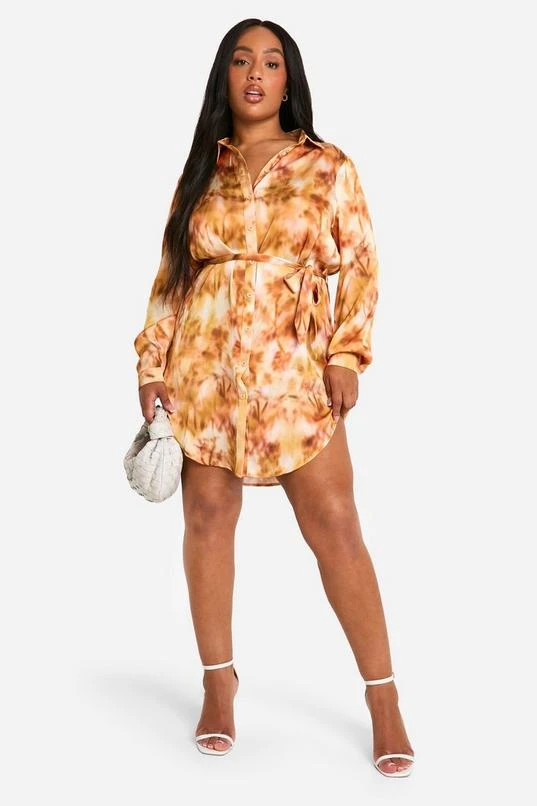 BOOHOO Plus Marble Printed Tie Belt Shirt Dress