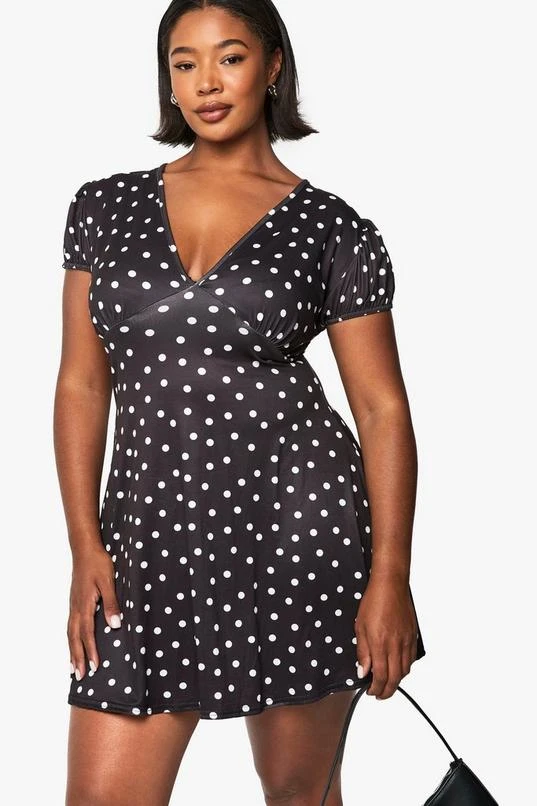 BOOHOO Plus Polka Dot Drop Hem Mini Skater Dress