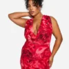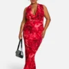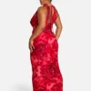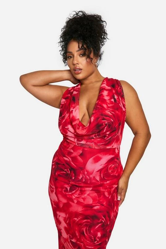 BOOHOO Plus Rose Printed Mesh Deep Cowl Maxi Dress