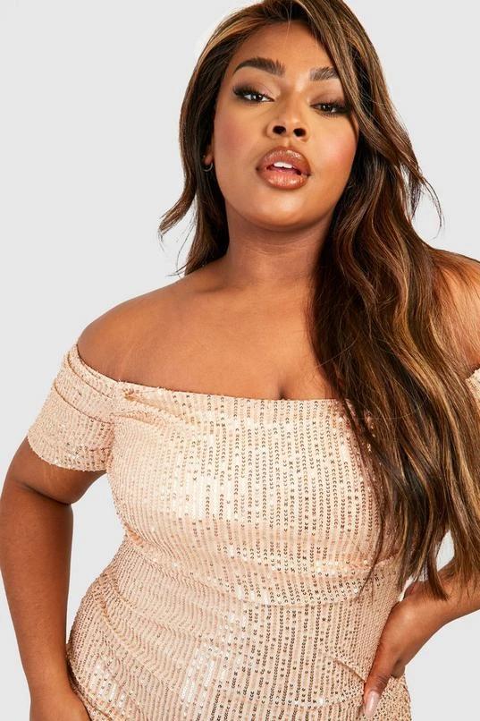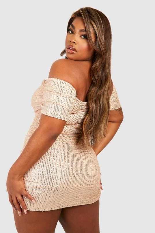 BOOHOO Plus Sequin Ruched Off Shoulder Mini Dress