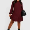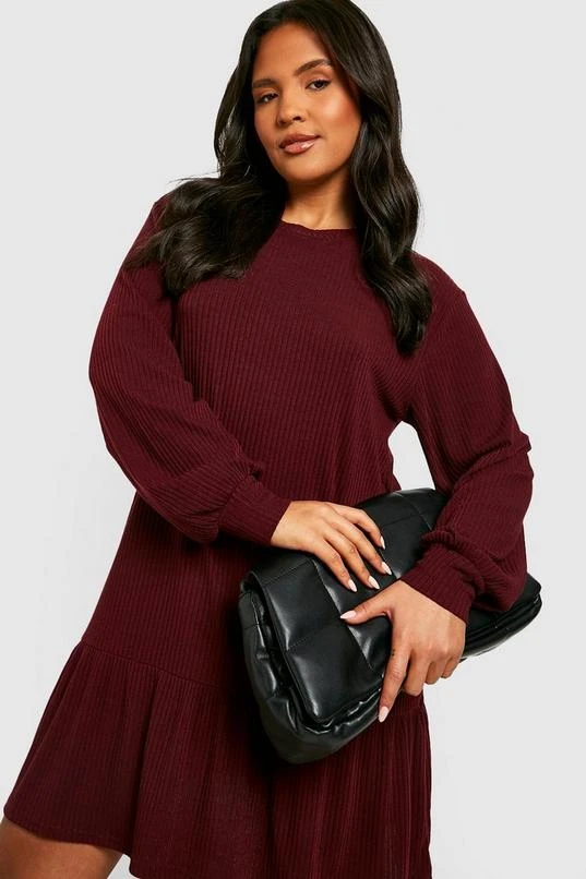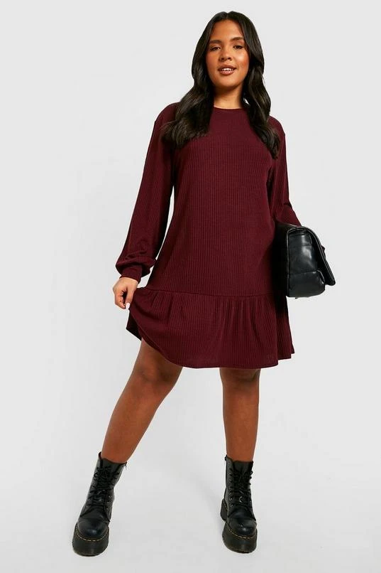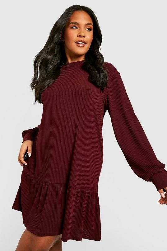 BOOHOO Plus Soft Rib Ruffle Hem Smock Dress