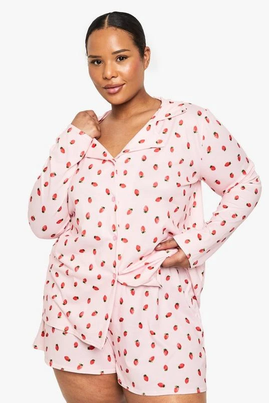 BOOHOO Plus Strawberry Print Long Sleeve & Short PJ Set