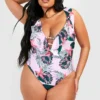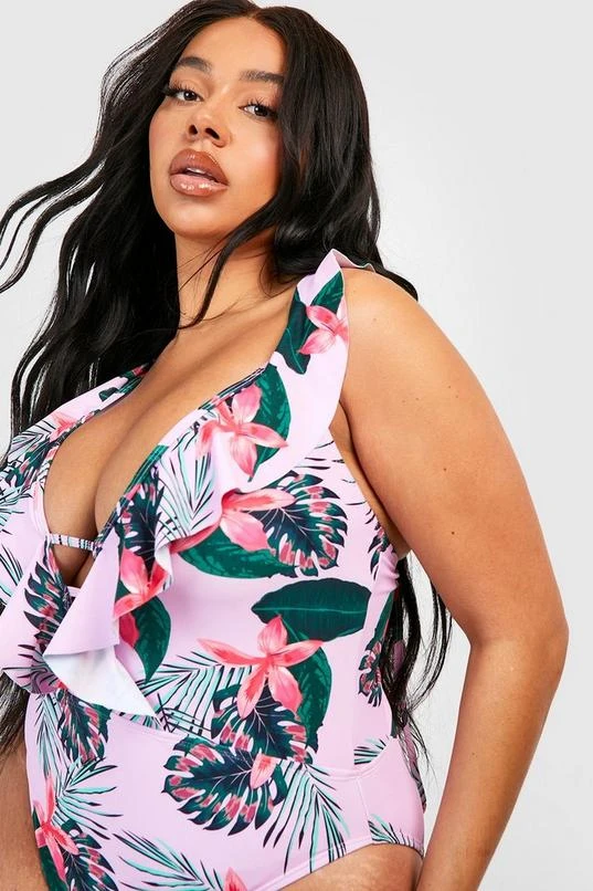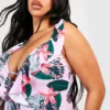 BOOHOO Plus Tropical Ruffle Plunge Swimsuit