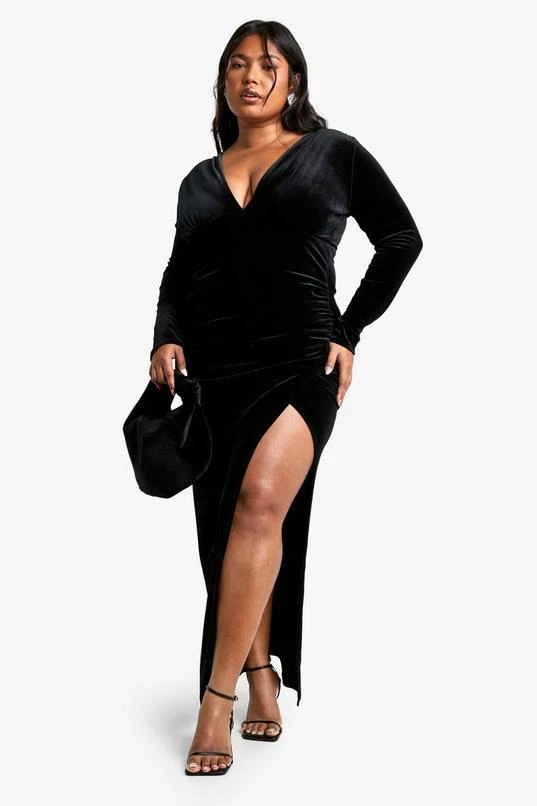 BOOHOO Plus Velvet Wrap Ruched Wrap Maxi Dress