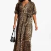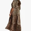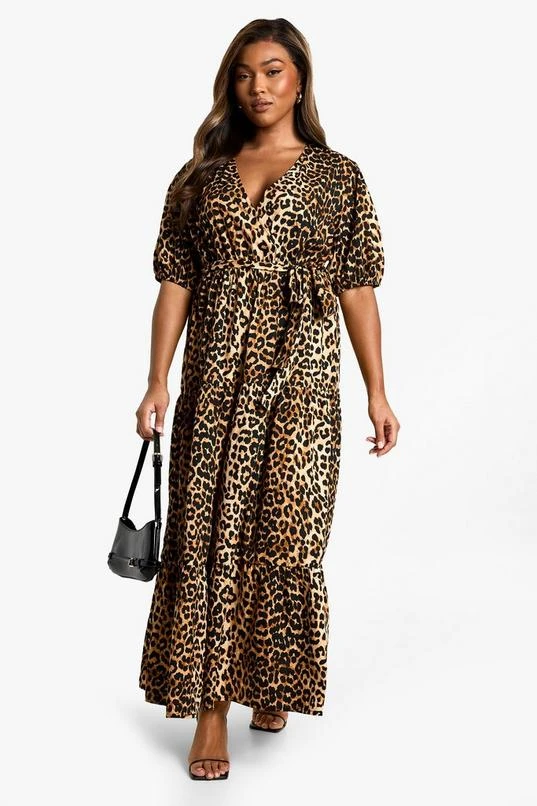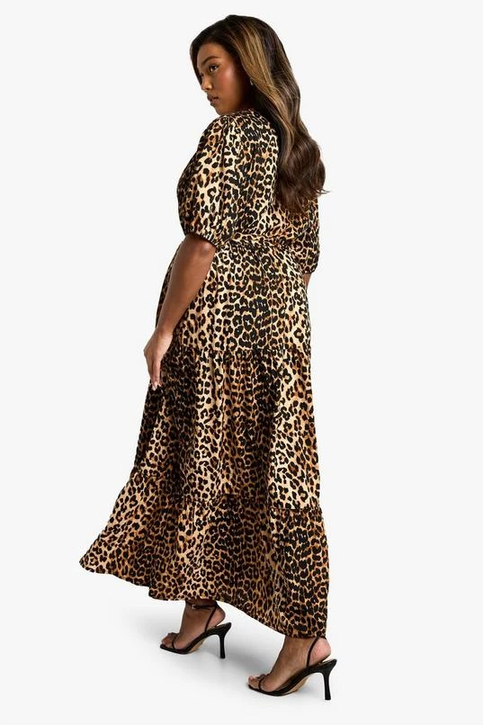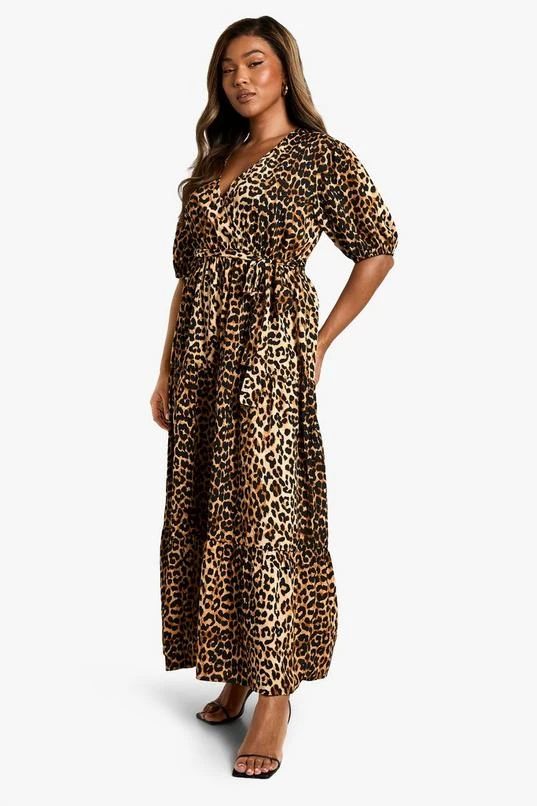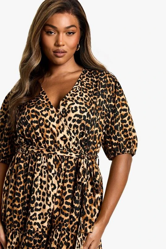 BOOHOO Plus Woven Leopard Print Wrap Tiered Smock Dress