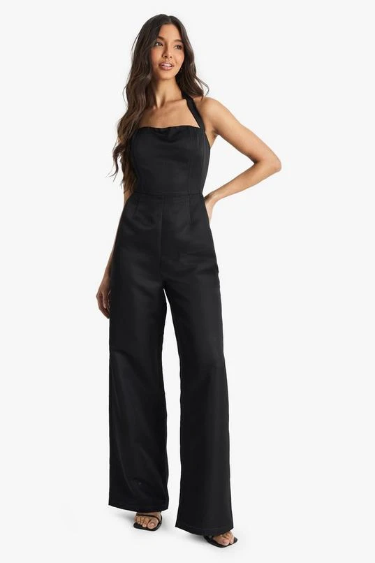 BOOHOO Premium Satin Halterneck Wide Leg Jumpsuit