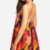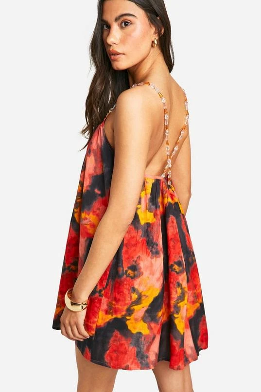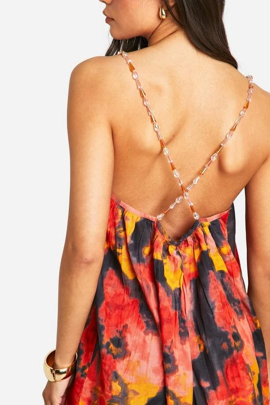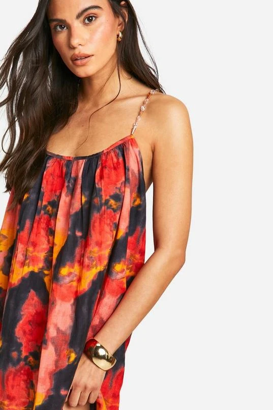BOOHOO Printed Beaded Strap Linen Look Mini Dress