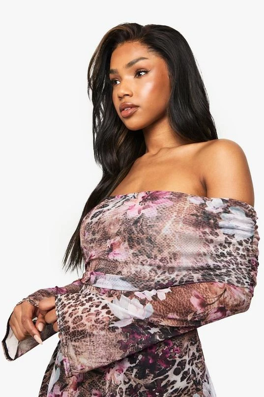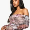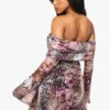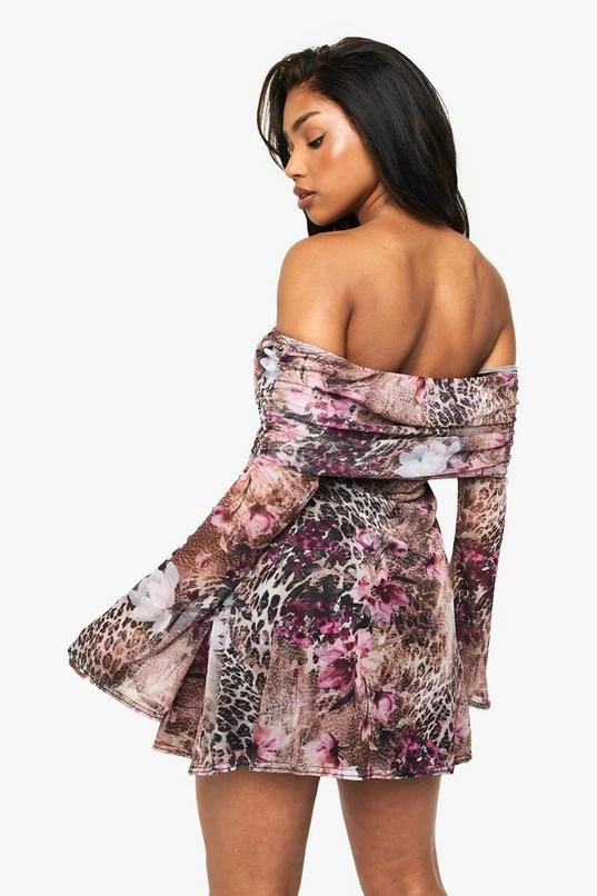 BOOHOO Printed Mesh Deep Bardot Mini Dress