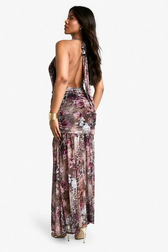 BOOHOO Printed Mesh Halterneck Ruched Maxi Dress