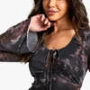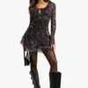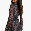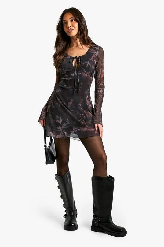 BOOHOO Printed Mesh Tie Front Flare Sleeve Mini Dress