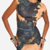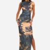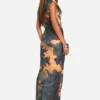 BOOHOO Printed Sheer Boat Neck Cap Sleeve Maxi Dress