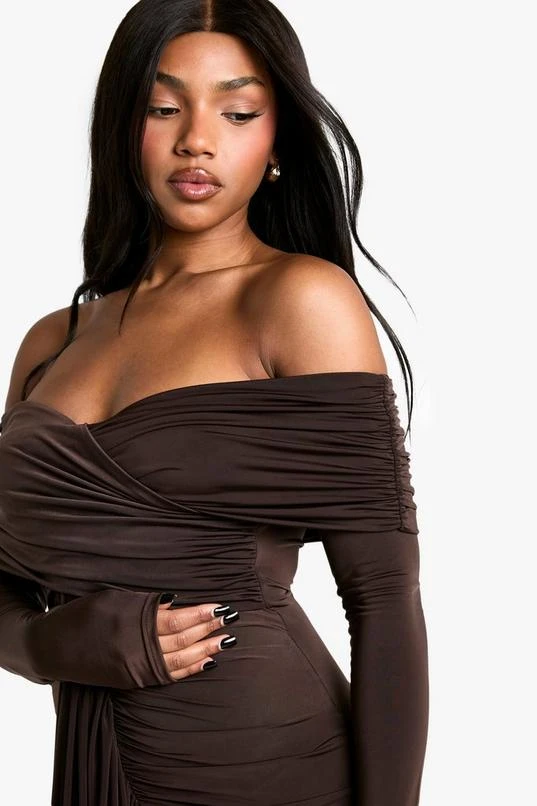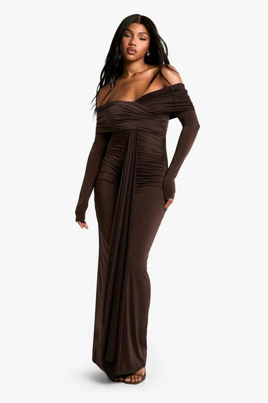 BOOHOO Ruched Bardot Long Sleeve Maxi Dress