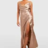 BOOHOO Satin Cowl Neck Ruched Maxi Dress
