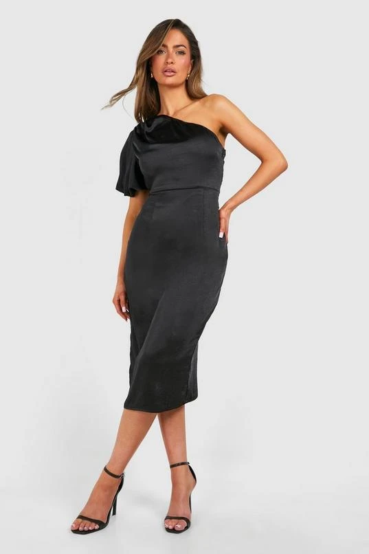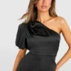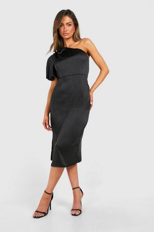 BOOHOO Satin Puff Sleeve Asymmetric Midi Dress