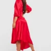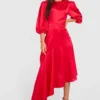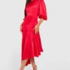 BOOHOO Satin Puff Sleeve Ruffle Hem Midi Dress