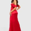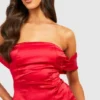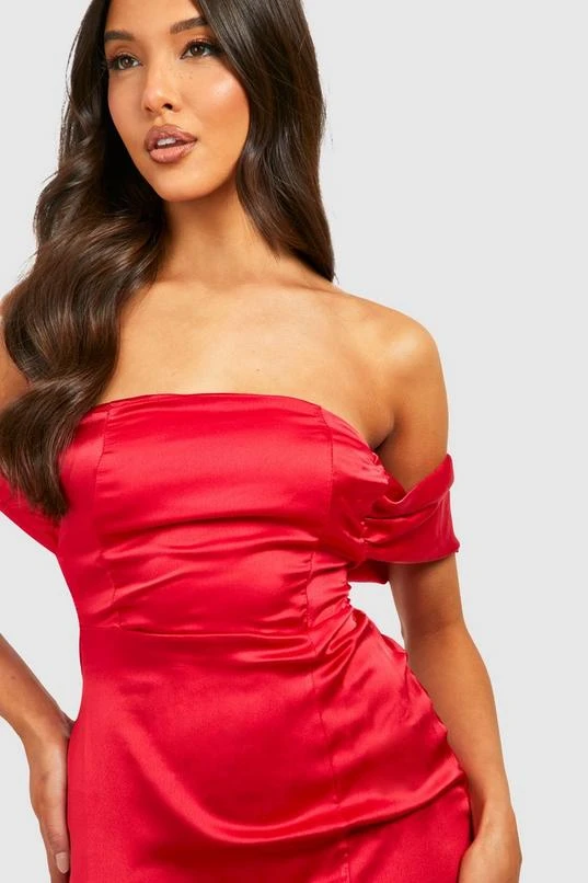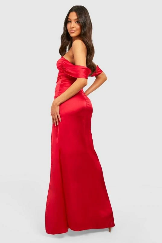 BOOHOO Satin Ruched Off Shoulder Maxi Dress