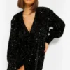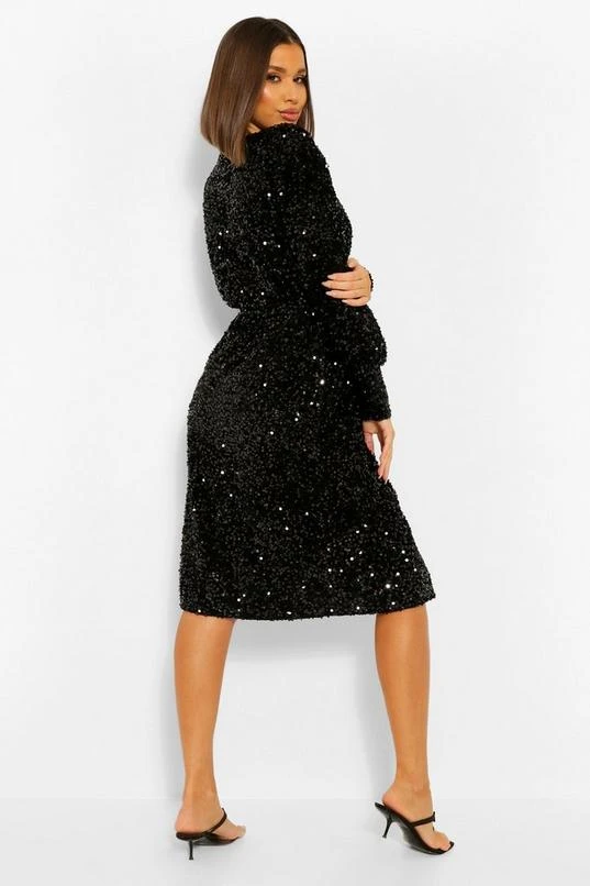 BOOHOO Sequin Long Sleeve Tie Waist Midi Party Dress