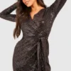 BOOHOO Sequin Long Sleeve Wrap Detail Maxi Dress