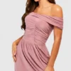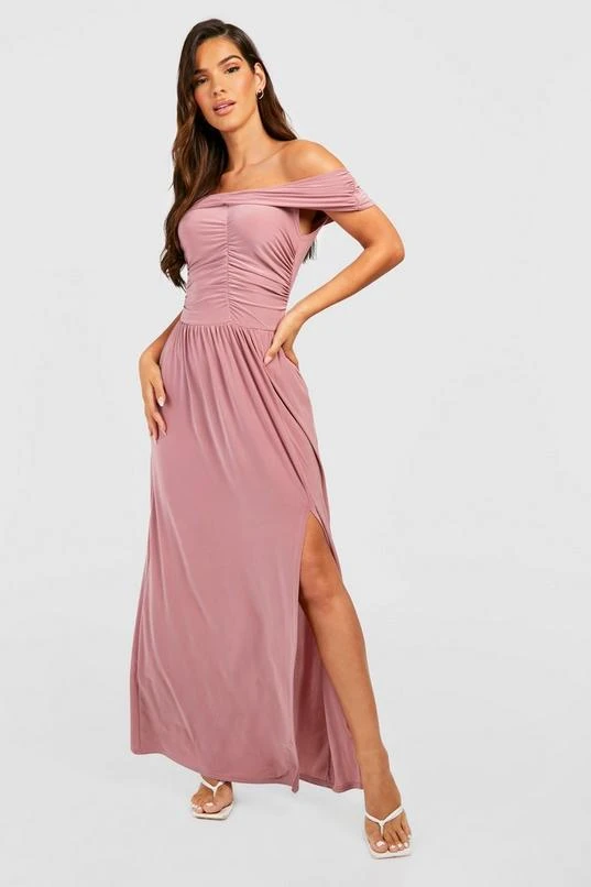 BOOHOO Slinky Ruched Off The Shoulder Split Maxi Dress