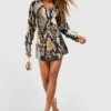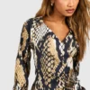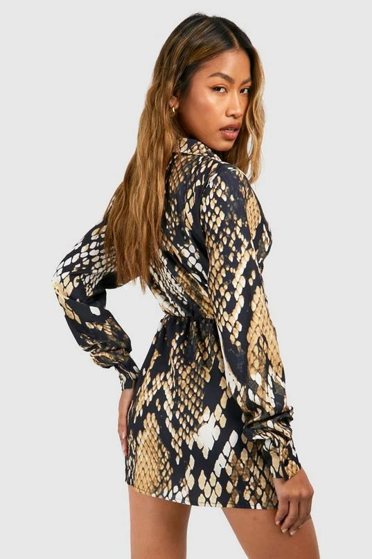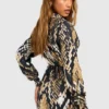 BOOHOO Snake Satin Wrap Shirt Dress
