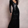 BOOHOO Tall Damask Sequin Plunge Maxi Dress