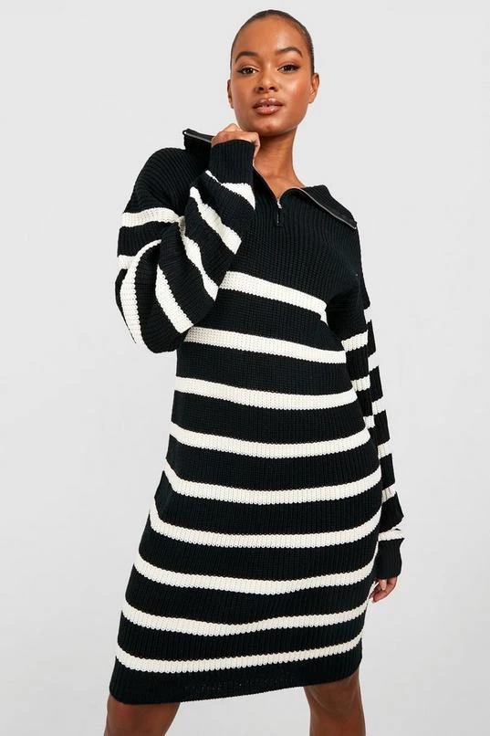 BOOHOO Tall Half Zip Striped Sweater Dress