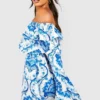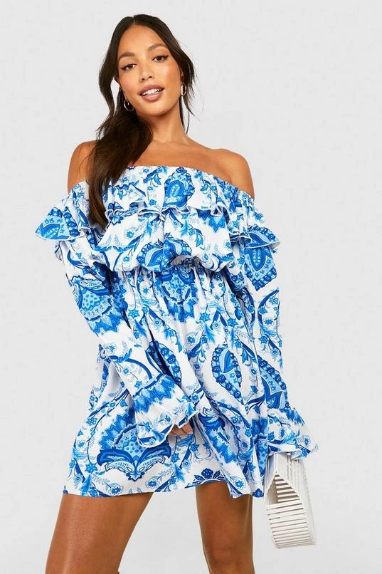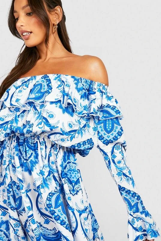 BOOHOO Tall Porcelain Print Off The Shoulder Ruffle Mini Skater Dress