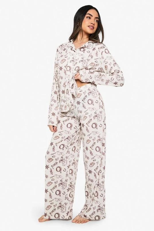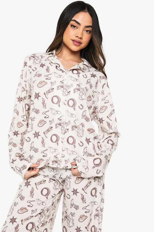 BOOHOO Western Print Long Sleeve Shirt & Trousers Pyjama Set
