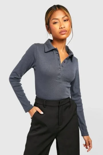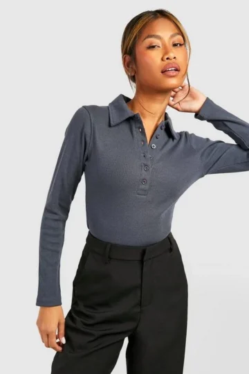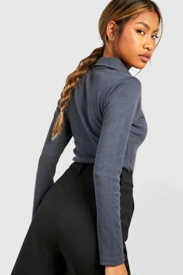 BOOHOO Basic Rib Collared Long Sleeve Bodysuit