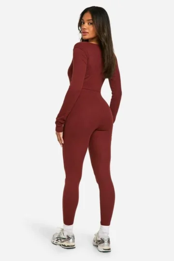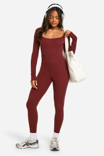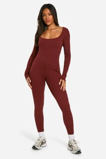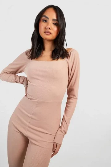 BOOHOO Basic Square Neck Rib Long Sleeve Unitard Jumpsuit