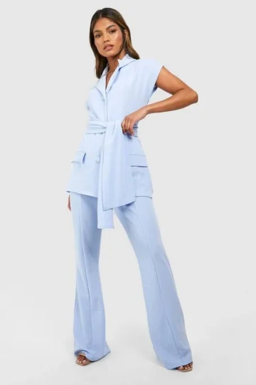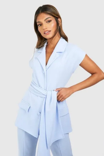 BOOHOO Jersey Knit Crepe Tie Waist Sleeveless Blazer