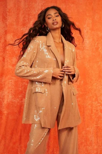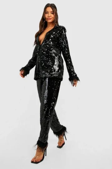 BOOHOO Sequin Feather Trim Tailored Blazer