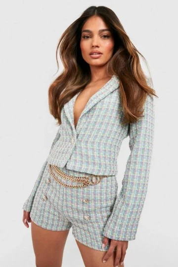 BOOHOO Tweed Flannel Cropped Tailored Blazer