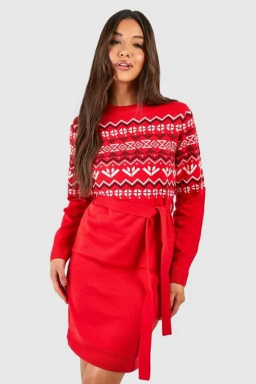 BOOHOO Belted Fairisle Christmas Sweater Dress