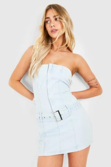 BOOHOO Belted Bandeau Denim Mini Dress