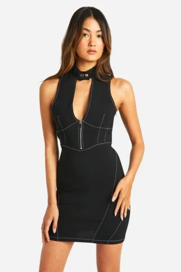 BOOHOO Bengaline Contrast Stitching Zip Mini Dress