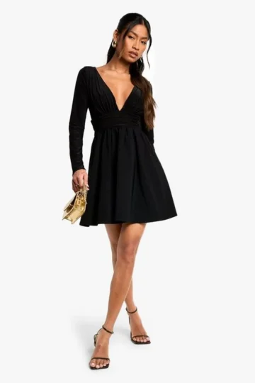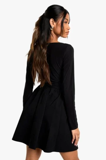 BOOHOO Bengaline And Slinky Mix Long Sleeve Skater Dress