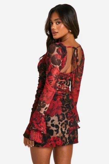 BOOHOO Boat Neck Rose Mesh Print Flare Sleeve Mini Dress