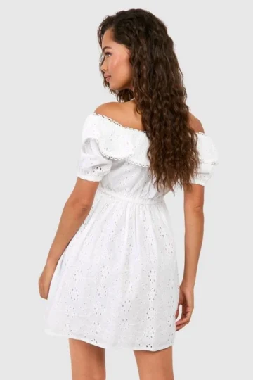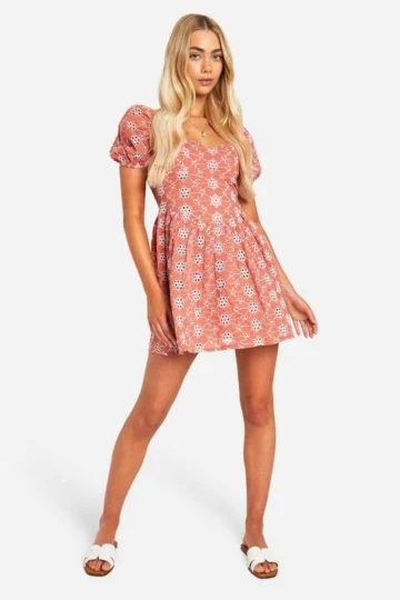 BOOHOO Broderie Puff Sleeve Tiered Mini Dress