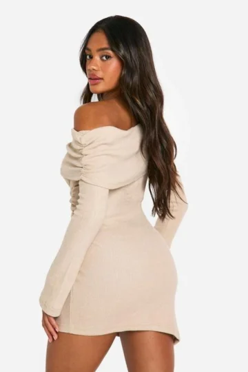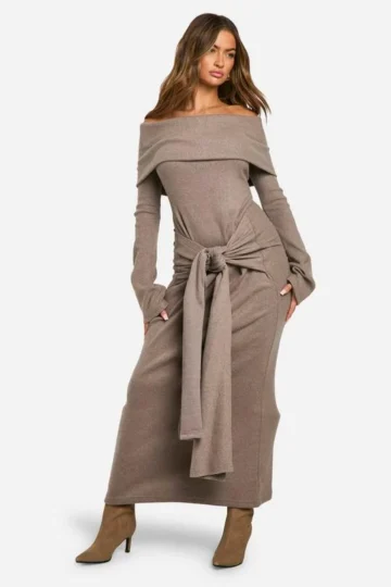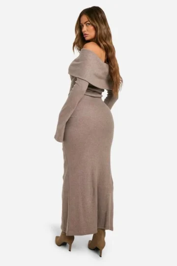 BOOHOO Brushed Rib Bardot Maxi Dress