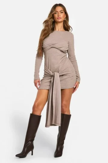 BOOHOO Brushed Rib Tie Long Sleeve Mini Dress